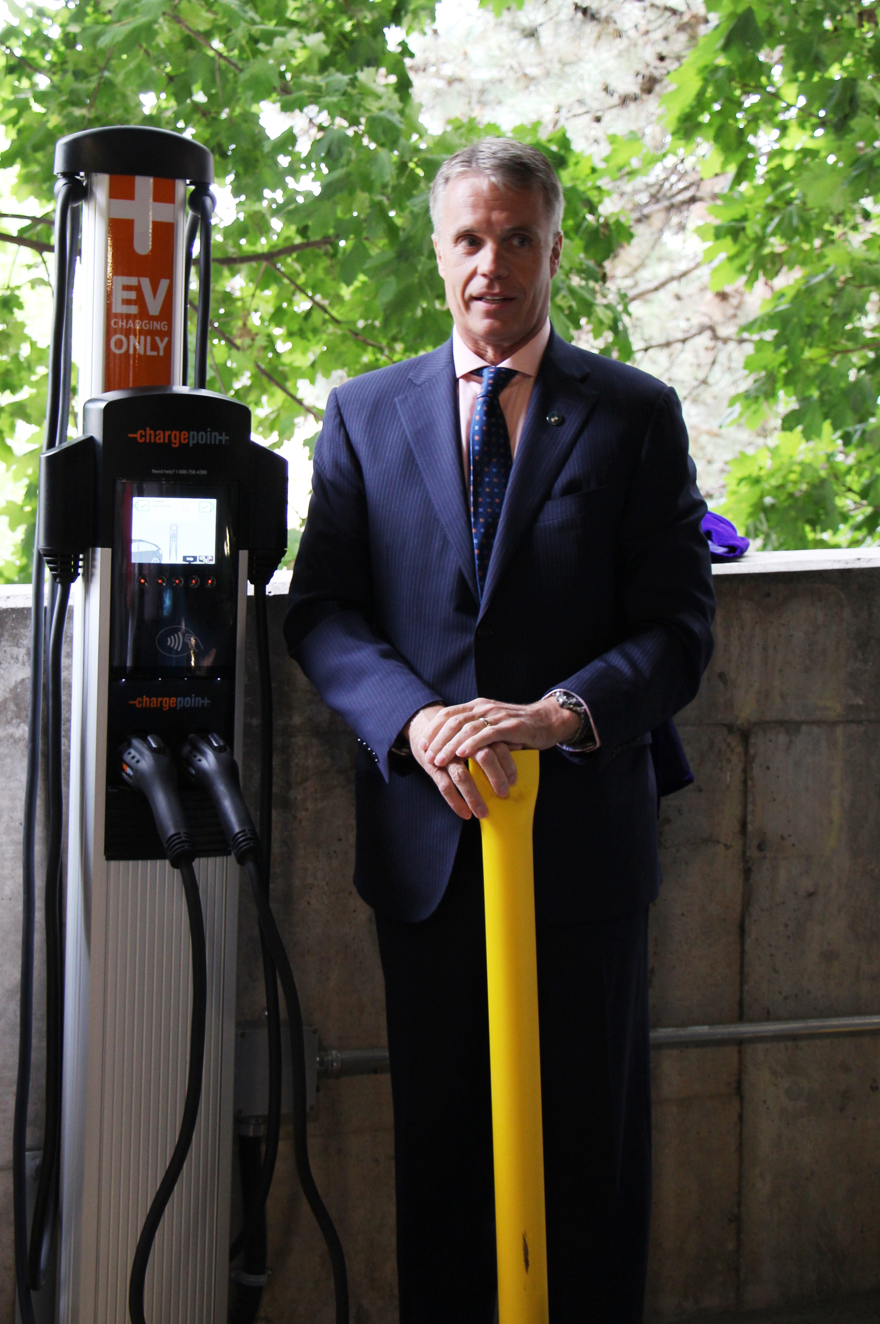 Mayor Goldring unveils the City of Burlington’s Level 2 EV charging station at 414 Locust St. on Aug. 26, 2015.